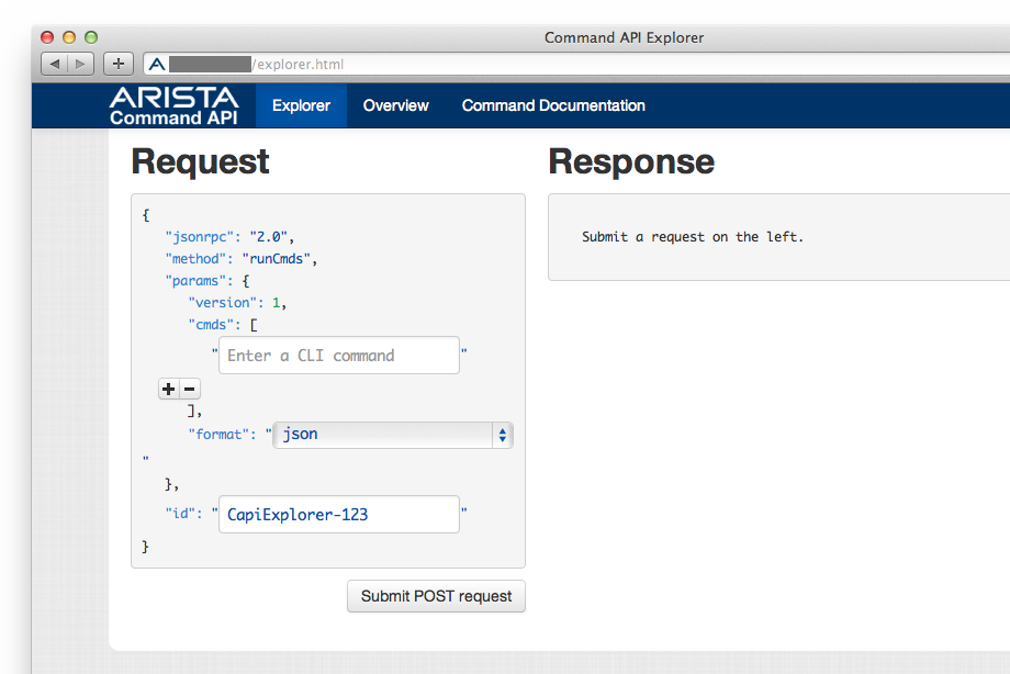 Command API Explorer is very useful tool. It shows the format of the eAPI request and the response. It will help you to write and debug an eAPI client application.